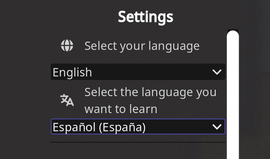 When the game starts, you will be able to set your base language and the language you want to learn: